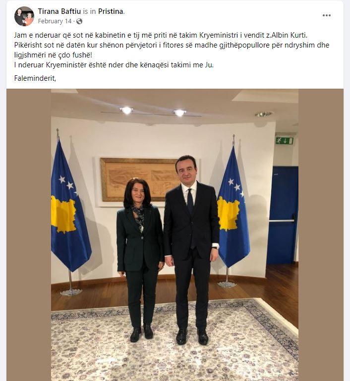 Krejt në fund vlen të theksohet se, Tirana Baftiu-Hasani del të jetë edhe mbështetëse e kryeministrit Albin Kurti.