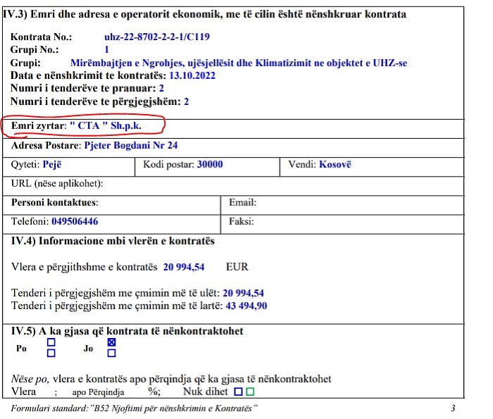 Periskopi: Në vitin 2022 tek Komisioni rregullativ i Prokurimit me kompaninë CTA, në të cilën jeni prona ju, a mund të na konfirmoni se a keni marrë një tender për mirëmbajtjen e ngrohjes së ujësjellësit dhe klimatizimit. Vlera e këtij tenderi nga autoriteti kontraktues ka qenë 100 mijë euro. 21 mijë është nënshkruar kontrata.