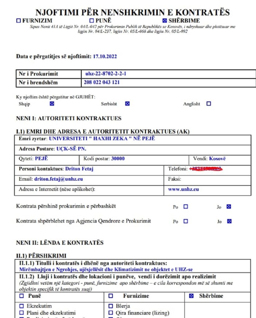 Universiteti i Pejës, në vitin 2022 kishte hapur një tender për “Mirëmbajtjen e Ngrohjes, ujësjellësit dhe Klimatizimit në objektet e UHZ-së”.