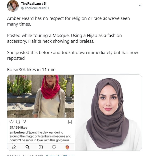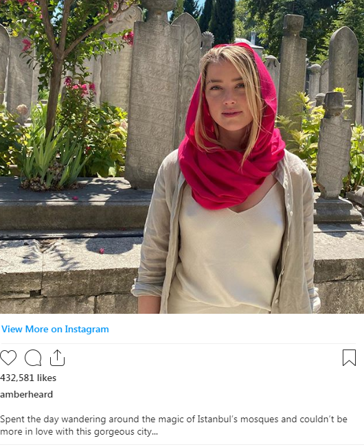 Amber Heard nuk ka respekt as për fenë dhe as për kulturën dhe këtë e kemi vërtetuar shumë herë. Poston teksa viziton një xhami. Përdor një Hijab si aksesor mode. Flokët dhe qafa e zbuluar dhe nga ana tjetër pa të brendshme.”ka shkruar një ndjekës.