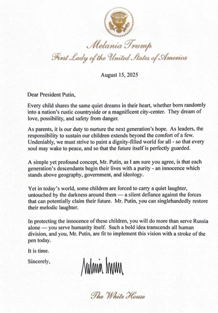 Melania Trump, gruaja e presidentit të SHBA-së, Donald Trump, i ka dërguar një letër “paqeje” presidentin rus, Vladimir Putin, duke e shprehur shqetësimin për fatin e fëmijëve në luftën e Ukrainës dhe duke e inkurajuar atë të “mbrojë pafajësinë e tyre”. Letra iu dorëzua personalisht Putinit nga Trumpi gjatë një takimi që dy liderët kishin në Alaska të shtunën.