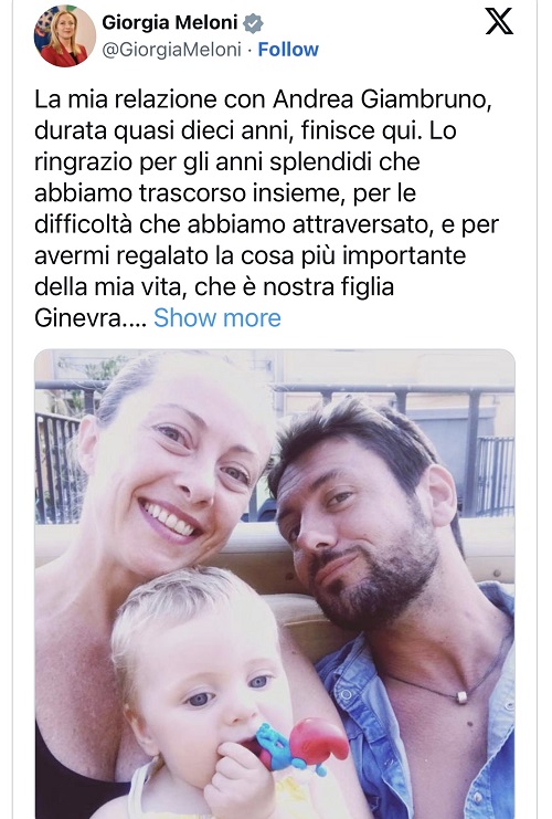 Mesazhi, i publikuar edhe në llogaritë e tjera sociale të Melonit, vjen pas videove jashtë transmetimit të emisionit të njohur Striscia la Notizia, të cilat përmbajnë deklarata seksiste dhe seksuale të bëra nga Giambruno në emisionin e tij Diario del giorno, të transmetuar në Rete 4.
