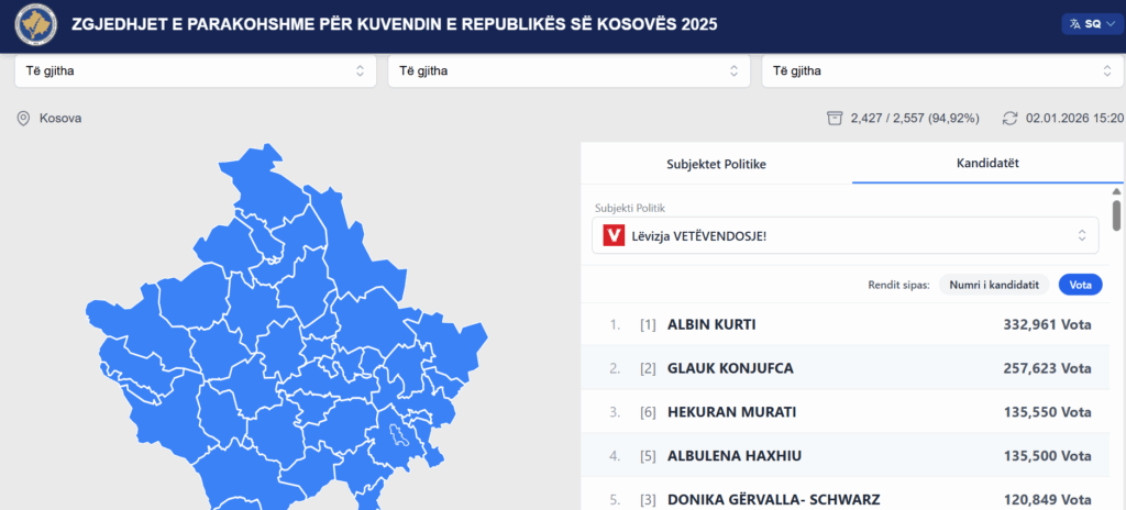Kandidati për kryeministër, Albin Kurti, ka marrë 332 mijë e 961 vota.