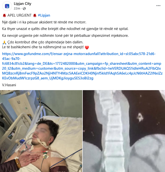 I riu nga Lipjani aksidentohet rëndë me motor – kërkohet ndihmë urgjente për t’i mbuluar shpenzimet mjekësore