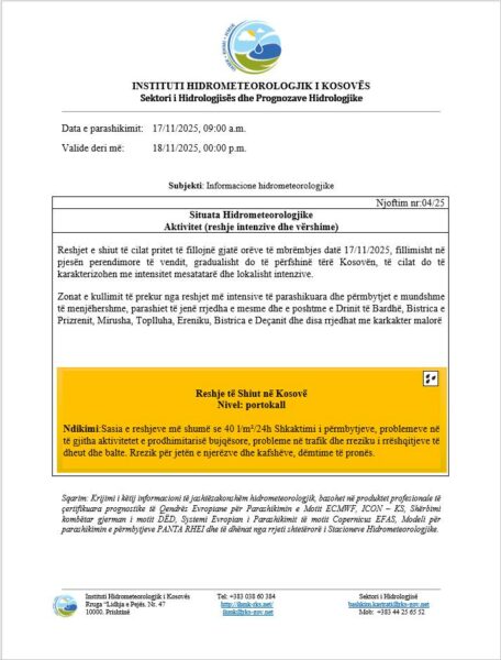 Instituti Hidrometeorologjik i Kosovës (IHMK) ka njoftuar se gjatë datave 18–19 nëntor 2025 pritet të ketë reshje shiu në gjithë vendin, ndërsa në disa zona reshjet do të jenë të intensitetit të lartë, duke rritur rrezikun e vërshimeve të shpejta.