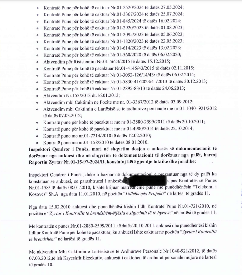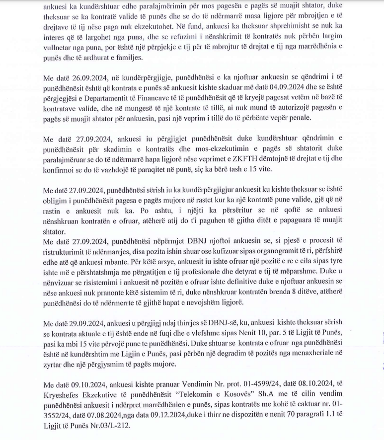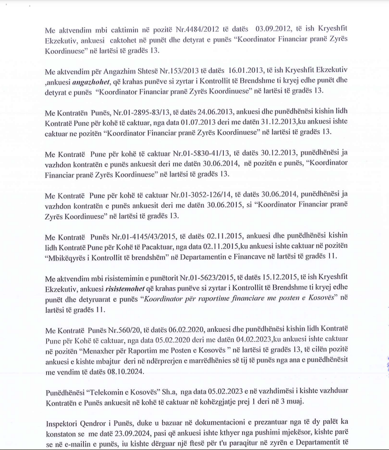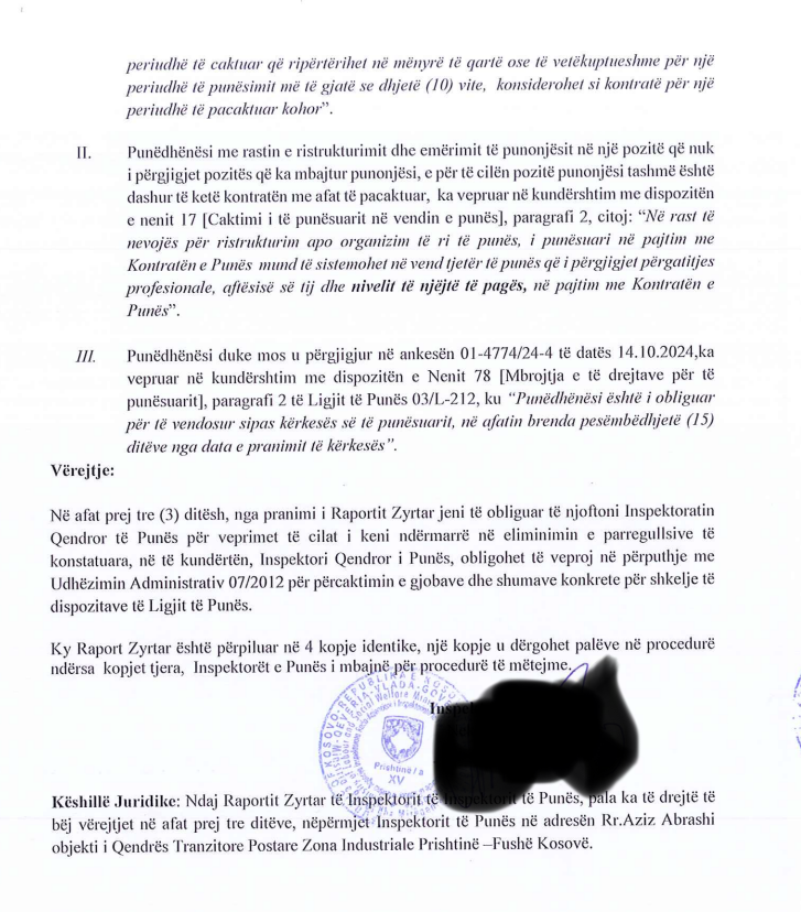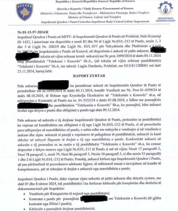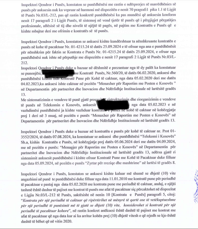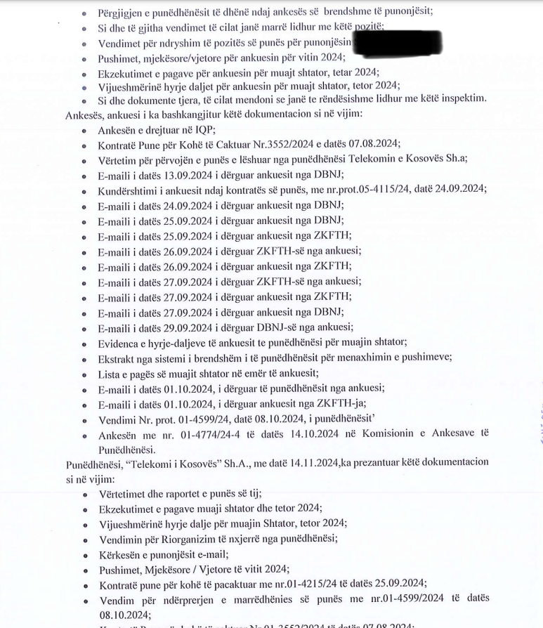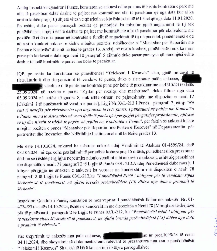 Në këtë dokument mes të tjerave thuhet se pas shqyrtimit të ankesës nga pala ankuese S.H. të datës 04.11.2024 dhe shqyrtimit të dokumentacionit relante të prezantuar nga ana e punëdhënësit “Telekomi i Kosovës” është bërë konstatim i këtyre parregullësive.