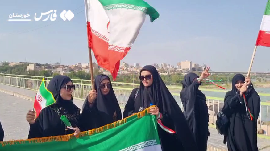 Një video e shpërndarë nga Fars News Agency tregon një grup qytetarësh duke mbajtur një flamur të madh iranian mbi urën ikonike Pol Sefid, në jugperëndim të Iran.
