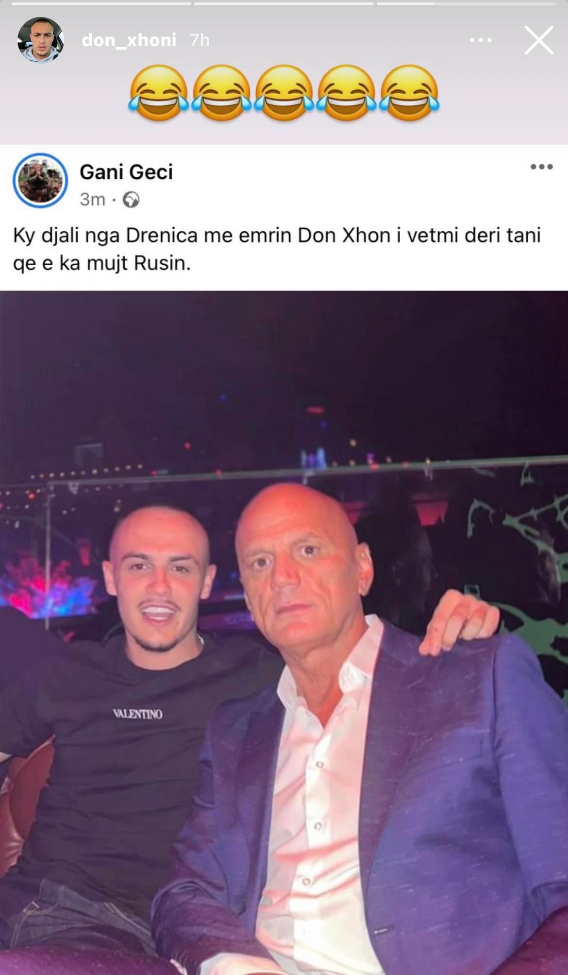 Së fundmi, Don Xhoni ka publikuar një foto me politikanin Gani Geci, ku ky i fundit ka shkruar në postimin e dyshes: Ky djali nga Drenica me emrin Don Xhon i vetmi deri më tani që e ka mundur Rusinë”.