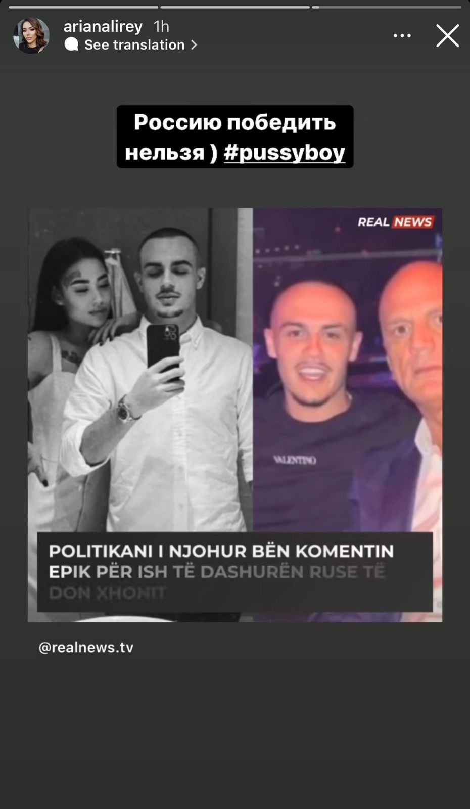 Ajo ka publikuar një story të lajmit, ku ka shkruar: “Rusia nuk mposhtet”duke etiketuar reperin “p*ssy boy”.