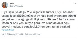 “Tri vite lidhje, rreth dy vite fejesë, kemi jetuar bashkë për 1 vjet e gjysmë dhe më nxori nga shtëpia 2 muaj para dasmës, sepse faktet ishin shumë të rënda për të. 3 javë pasi marrëdhënia e jonë mori fund, njerëzit e panë me një person të ri dhe tash ai e ka shfaqur këtë hapur në rrjetet sociale. Të lutem, më lër të qetë”, ka shkruar modelja, Vesa Vllasaliu.