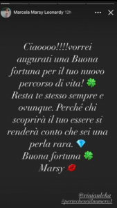 ‘’Çkemi! Dëshiroj të të uroj fat të mbarë në udhëtimin tënd të ri në jetë. Qëndro vetvetja kudo dhe kurdoherë. Personi që do të zbulojë qenien tënde do të kuptojë se je një perlë e rrallë. Fat të mbarë, Marsy’’, ka shkruar ajo.