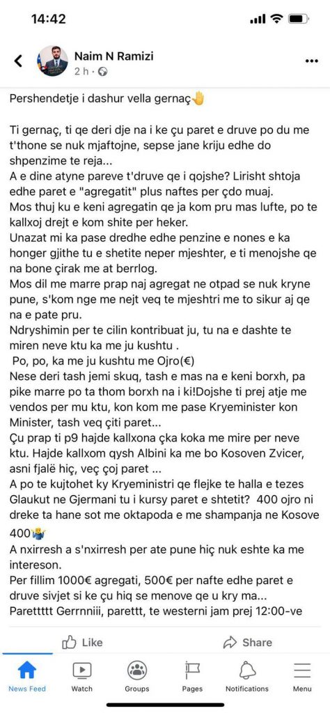 Ramizi përmes një postimi në profilin e tij në Facebook i ka shkruar “vëllait gërnaç’ në diasporë duke i thënë se ndryshimin për të cilin kontribuan ata do t’iu kushtojë me euro, përcjell Periskopi.