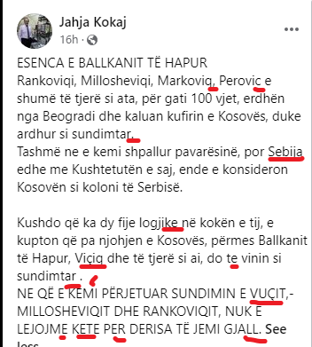 “Kushdo që ka dy fije logjike në kokën e tij, e kupton që pa njohjen e Kosovës, përmes Ballkanit të Hapur, Vuçiqi dhe të tjerë si ai, do të vinin si sundimtarë,” – ka shkruar z. Kokaj, përcjell Periskopi.