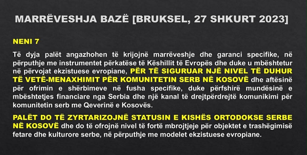 Më 8 dhjetor të vitit 2023, në një intervistë për Zërin e Amerikës, Glauk Konjufca kishte deklaruar se Neni 7 në Marrëveshjen e Bruskelit, e arritur mes kryeministrit Kurti dhe presidentit serb, Aleksandër Vuçiq, është pikë e vendosur në favor të Serbisë.