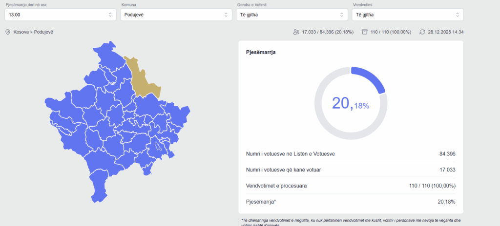 Sipas të dhënave të Komisionit Qendror të Zgjedhjeve, në Podujevë, nga 84 mijë e 396 votues, deri tani të drejtën e tyre e kanë shfrytëzuar 17 mijë e 33 qytetarë, raporton Periskopi.