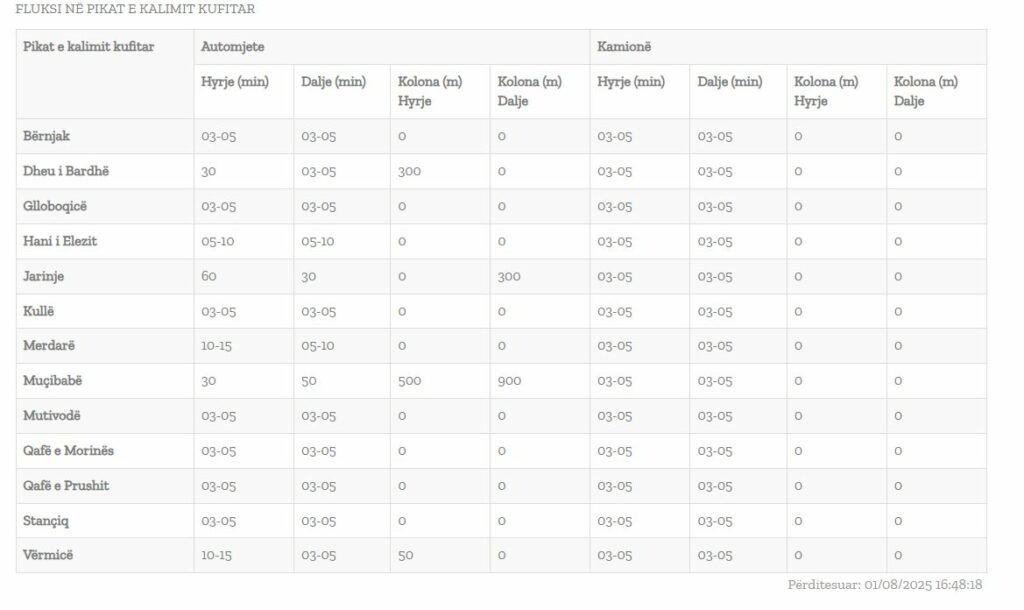 Bazuar në të dhënat e Qendrës Kombëtare për Menaxhim Kufitar, nga gjysmë ore po pritet edhe në pikëkalimet kufitare te Dheu i Bardhë dhe Muçibabë.