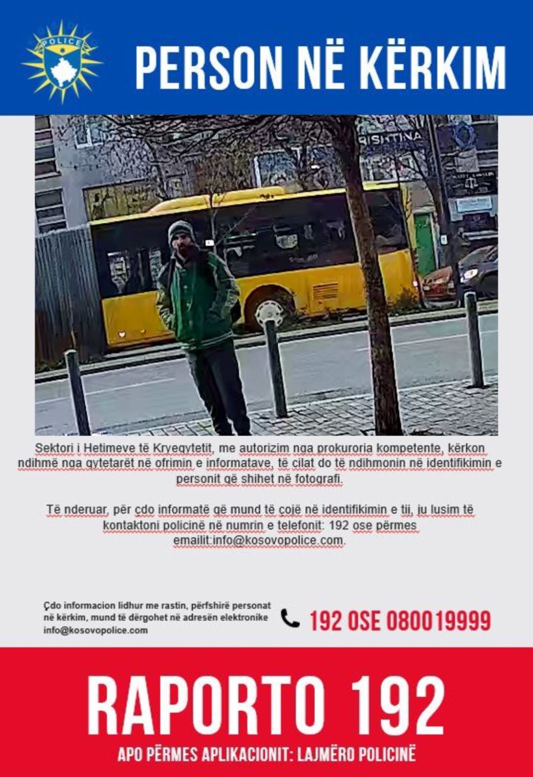 “Sektori i Hetimeve të Kryeqytetit, me autorizim nga prokuroria kompetente, kërkon ndihmë nga qytetarët në ofrimin e informatave, të cilat do të ndihmonin në identifikimin e personit që shihet në fotografi. Personi i dyshuar kërkohet për përfshirje në veprën penale ‘Vjedhje’”.
