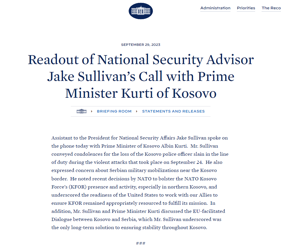 “Ndihmësi i Presidentit për Çështje të Sigurisë Kombëtare, Jake Sullivan ka biseduar sot në telefon me kryeministrin e Kosovës, Albin Kurti. Z. Sullivan përcolli ngushëllimet për humbjen e policit të Kosovës të vrarë në krye të detyrës gjatë sulmeve të dhunshme të ndodhura më 24 shtator. Ai gjithashtu shprehu shqetësimin për mobilizimet ushtarake serbe pranë kufirit me Kosovën. Ai vuri në dukje vendimet e fundit të NATO-s për të forcuar praninë dhe aktivitetin e Forcave të NATO-s në Kosovë (KFOR), veçanërisht në veri të Kosovës, dhe nënvizoi gatishmërinë e Shteteve të Bashkuara për të punuar me aleatët tanë për të siguruar që KFOR-i të ketë burimet e duhura për të përmbushur misionin e tij. Gjithashtu, z. Sullivan dhe kryeministri Kurti diskutuan për dialogun e ndërmjetësuar nga BE-ja ndërmjet Kosovës dhe Serbisë, për të cilin z. Sullivan theksoi se është e vetmja zgjidhje afatgjatë për të garantuar stabilitet në mbarë Kosovën”, thuhet në njoftim.