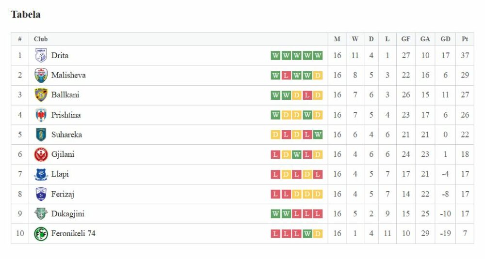 Më poshtë mund ta shihni tabelën e ligës elitare pas xhiros së 16-të. /Express/