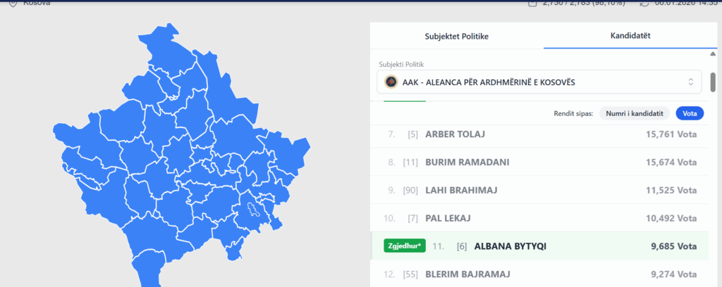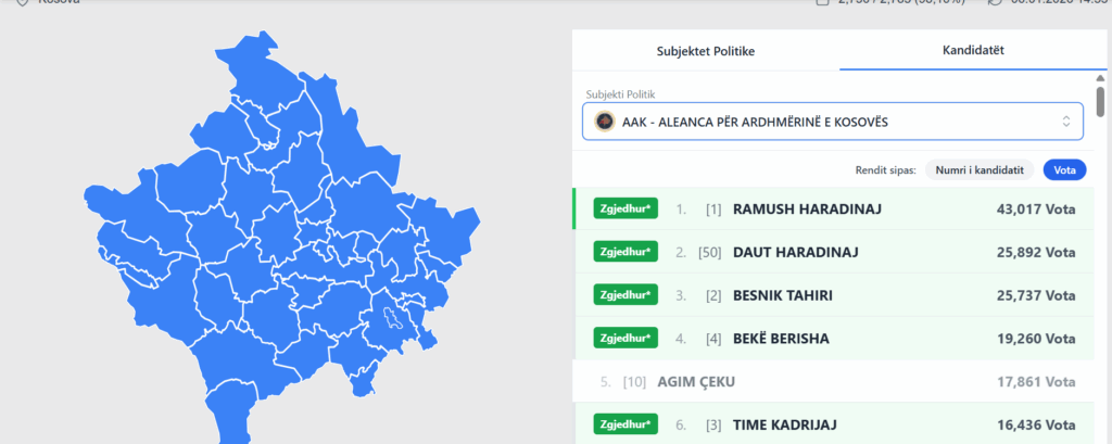 Komisioni Qendror i Zgjedhjeve (KQZ) ka publikuar në faqen e tij zyrtare listën e kandidatëve për deputetë të zgjedhur për mandatin e ri nga radhët e Aleancës për Ardhmërinë e osovës, së bashku me numrin e votave të fituara nga secili. Sipas të dhënave, AAK ka gjashtë deputetë në legjislaturën e re të kësaj qeverie.