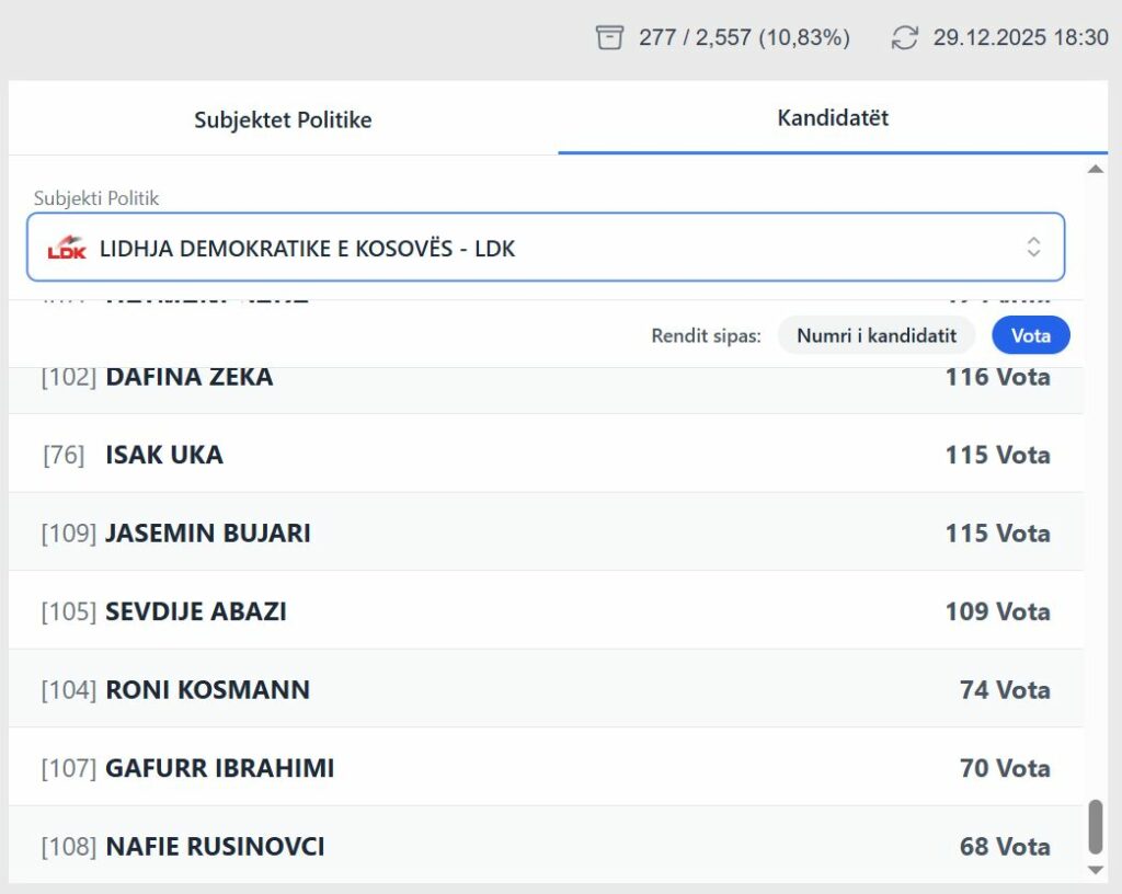 Sipas votave të deritanishme, tre deputetë të LDK-së kanë marrë më pak se 80 vota.