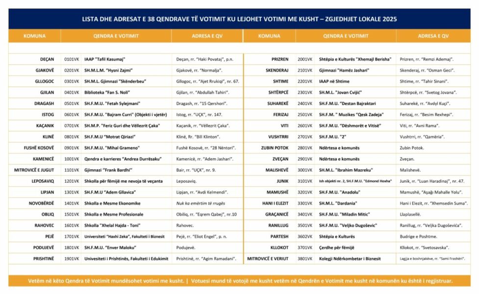 Kjo është lista dhe adresat e Qendrave të Votimit për votimin me kusht më 12 tetor 2025: