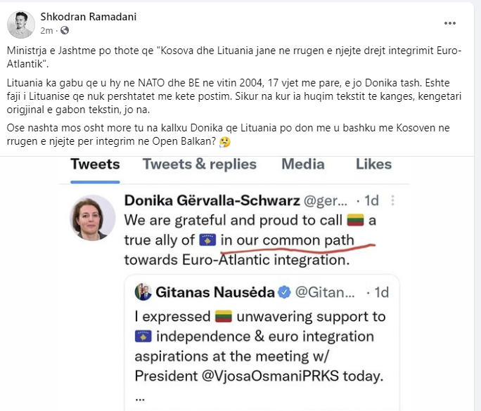 Një postim i bërë nga Donika Gërvalla Schwarz duket se ka kaluar i pavërejtur nga gazetarët [përfshirë edhe ne] mbi Lituaninë pas takimit të saj me presidentin lituan.