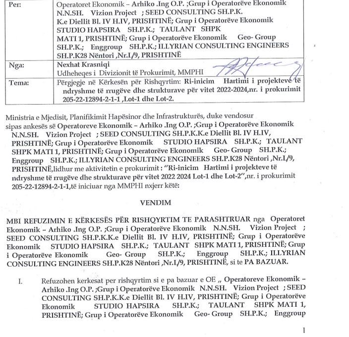 “Infratek” N.T.Sh, që është në pronësi të Florije Jahajt, është rekomanduar për kontratë në MMPHI para pak ditëve për tenderin Ri-inicim Hartimi i projekteve të ndryshme të rrugëve dhe strukturave për vitet 2022-2024”.