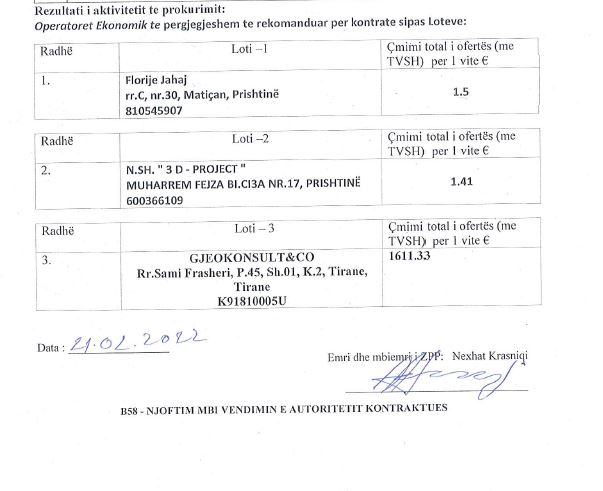 Për lot 2 është rekomanduar kompania “3D -Project”, me çmimin për njësi 1.45 euro, ose 320 mijë euro për dy vite. Për lot 3, fitues është nxjerr kompania nga Shqipëria që ka degën e saj në Kosovë  “Gjeokonsult& Co”, me çmim për njësi 1611.33 euro, ose 3: 160,000.00 euro për dy vite.