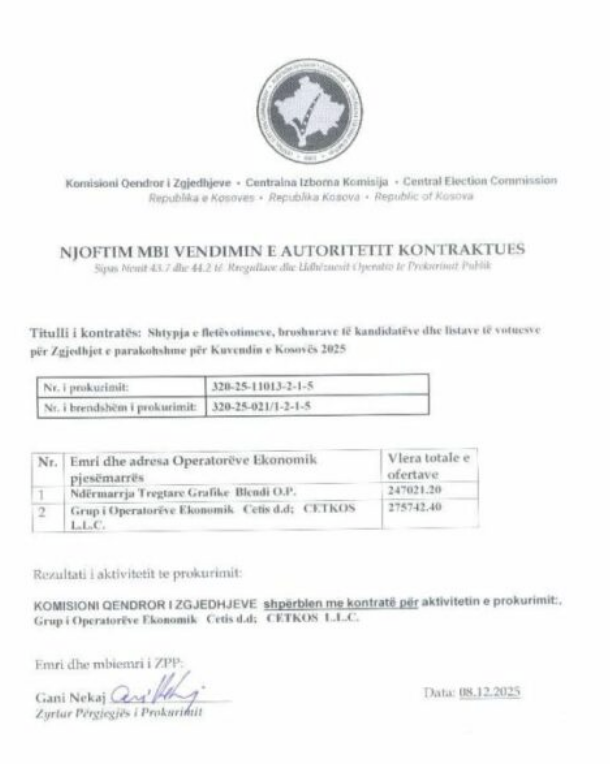 Komisioni Qendror i Zgjedhjeve ka shpërblyer sërish kompaninë sllovene, “Cetis d.d” dhe “Cetkos” l.l.C. e cila kishte fituar edhe tenderin në zgjedhjet e fundit, për shtypjen e fletëvotimeve dhe broshurave të kandidatëve për zgjedhjet e parakohshme parlamentare të vitit 2025.