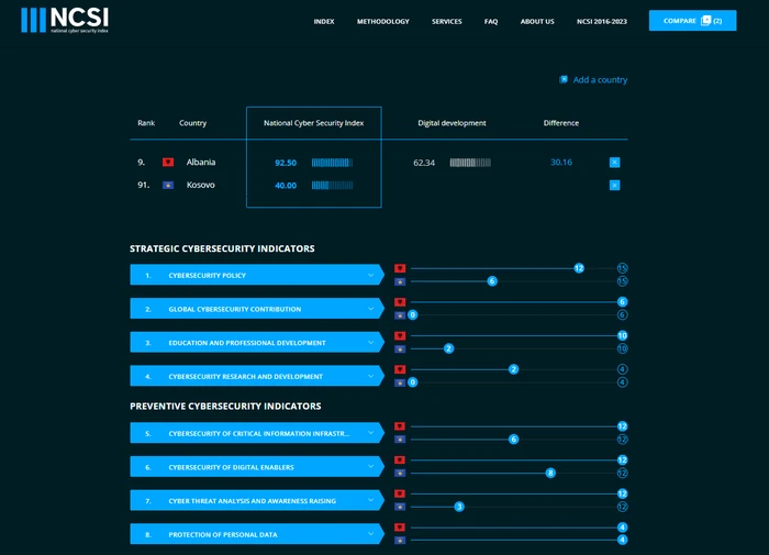 Në fushën e politikave të sigurisë kibernetike, Kosova ka arritur vetëm 6 pikë nga 15 sa janë në total, ndërsa Shqipëria ka arritur rreth 12 pikë. Po ashtu, në kontributin global në sigurinë kibernetike, Kosova rezulton me 0 ndërsa Shqipëria ka maksimumin e pikëve 6.