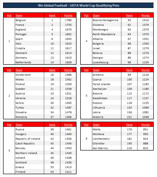 Në anë tjetër, vazon e parë për kualifikime në Botëror e kanë ruajtur: Belgjika, Franca, Anglia, Portugalia, Spanja, Italia, Kroacia, Danimarka, Gjermania dhe Holanda, por atë e ka humbur Zvicra që më nuk është në vazon e parë, por atë të dytën.
