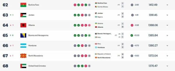 Në anën tjetër, Shqipëria ka pësuar rënie të lehtë, duke zbritur nga vendi i 63-të në të 64-in pas dy humbjeve të fundit.