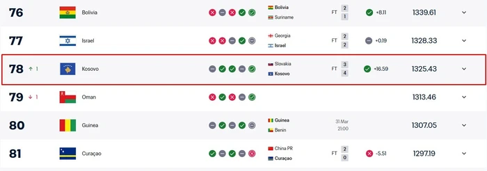 FIFA tashmë në kohë reale ndryshon pozitat e kombëtareve pas ndeshjeve që zhvillojnë, kësisoj Kosova ka marrë një ngritje në një vend më lart.