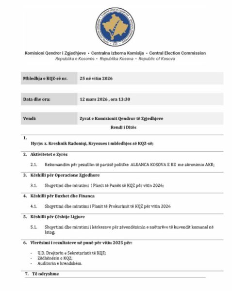 Sipas njoftimit për media, një nga pikat kryesore të rendit të ditës është shqyrtimi i rekomandimit për pezullimin e partisë politike Aleanca Kosova e Re (AKR).