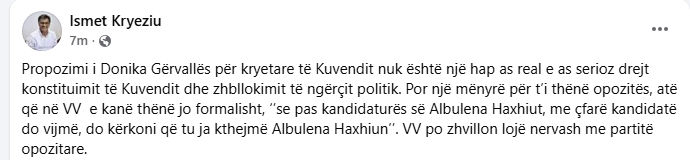 “Por një mënyrë për t’i thënë opozitës, atë që në VV e kanë thënë jo formalisht, ‘’se pas kandidaturës së Albulena Haxhiut, me çfarë kandidatë do vijmë, do kërkoni që tu ja kthejmë Albulena Haxhiun’’. VV po zhvillon lojë nervash me partitë opozitare””, ka shkruar ai.