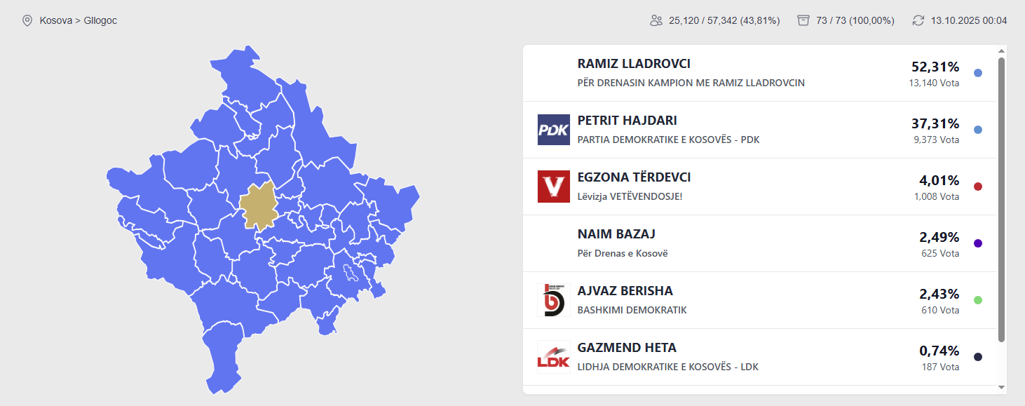 Ramiz Lladrovci ka fituar në Drenas me 52. 31 %, shkruan Periskopi.