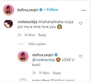 Këtë e konfirmon edhe një koment i kunatës së Dafinës, e cila i ka lënë një koment në postimin fundit të këngëtares në Instagram, ku shfaqet në veshje tradicionale.