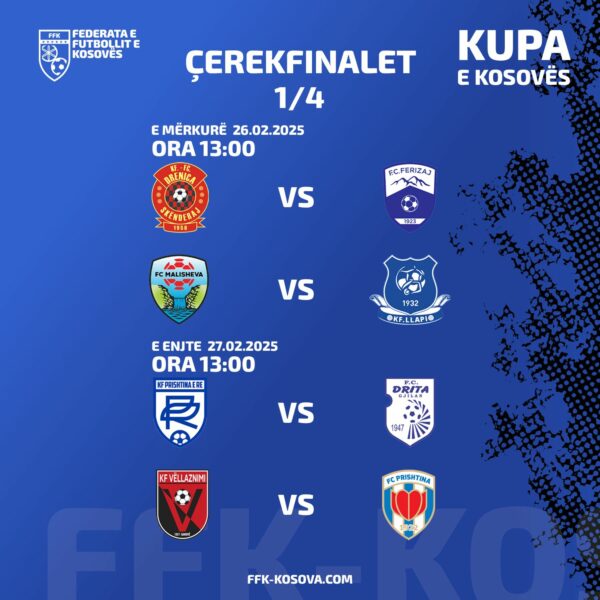 Ndërsa, ballafaqimi tjetër çerekfinal do të jetë ai mes Drenicës dhe Ferizajt, i cili do të luhet në stadiumin “Bajram Aliu” në Skenderaj.