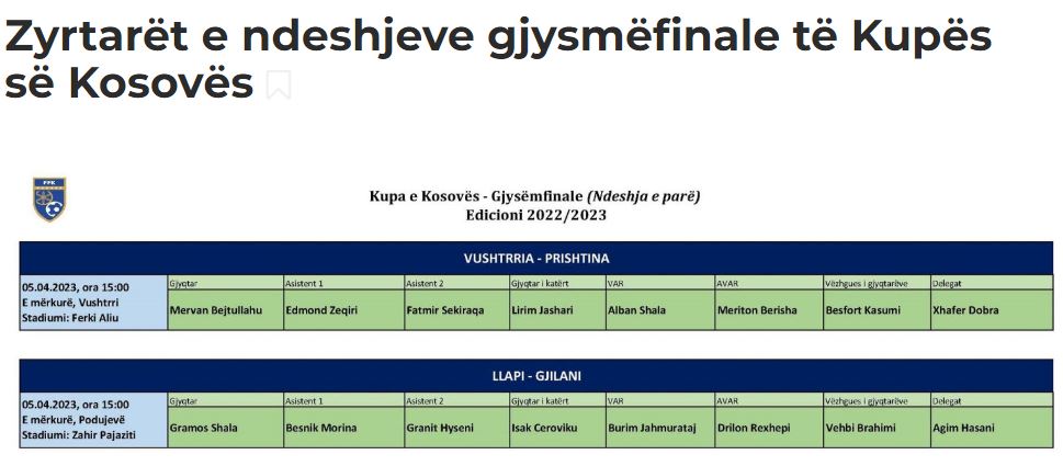 Dy ndeshjet e sotme të Kupës së Kosovës do të nisin në orën 15:00.