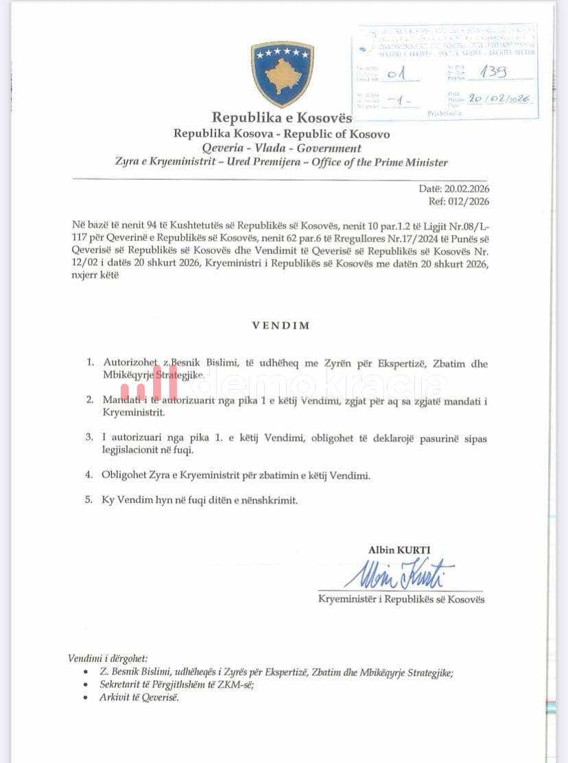 “Autorizohet z. Besnik Bislimi, të udhëheqë me Zyrën për Ekspertizë, Zbatim dhe Mbikëqyrje Strategjike. Mandati i të autorizuarit nga pika 1 e këtij Vendimi, zgjat për aq sa zgjatë mandati i Kryeministrit. I autorizuari nga pika 1 e këtij Vendimi, obligohet të deklarojë pasurinë sipas legjislacionit në fuqi. Obligohen Zyra e Kryeministrit për zbatimin e këtij Vendimi. Ky Vendim hyn në fuqi ditën e nënshkrimit”, thuhet në këtë vendim.