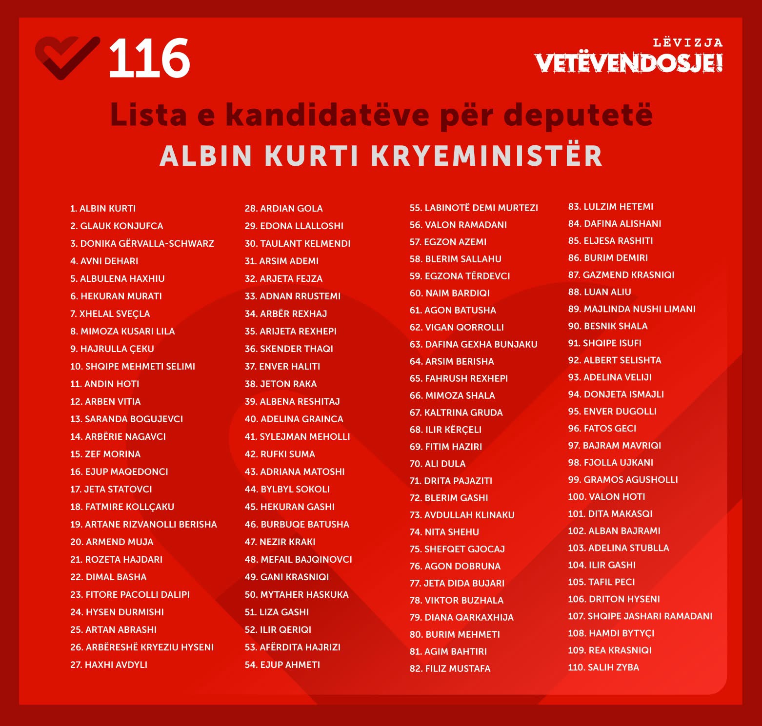 Në listën e Lëvizjes Vetëvendosje për zgjedhjet e jashtëzakonshëm të 28 dhjetorit nuk është se pati shumë ndryshime.