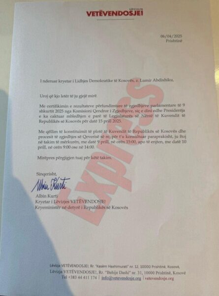 Kreu i Lëvizjes Vetëvendosje, Albin Kurti ia ka derguar Kryetarit të Lidhjes Demokratike të Kosovës, Lumir Abdixhikut, me të cilën e fton për konsultime para konstitumit të paralamentit.