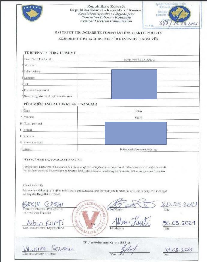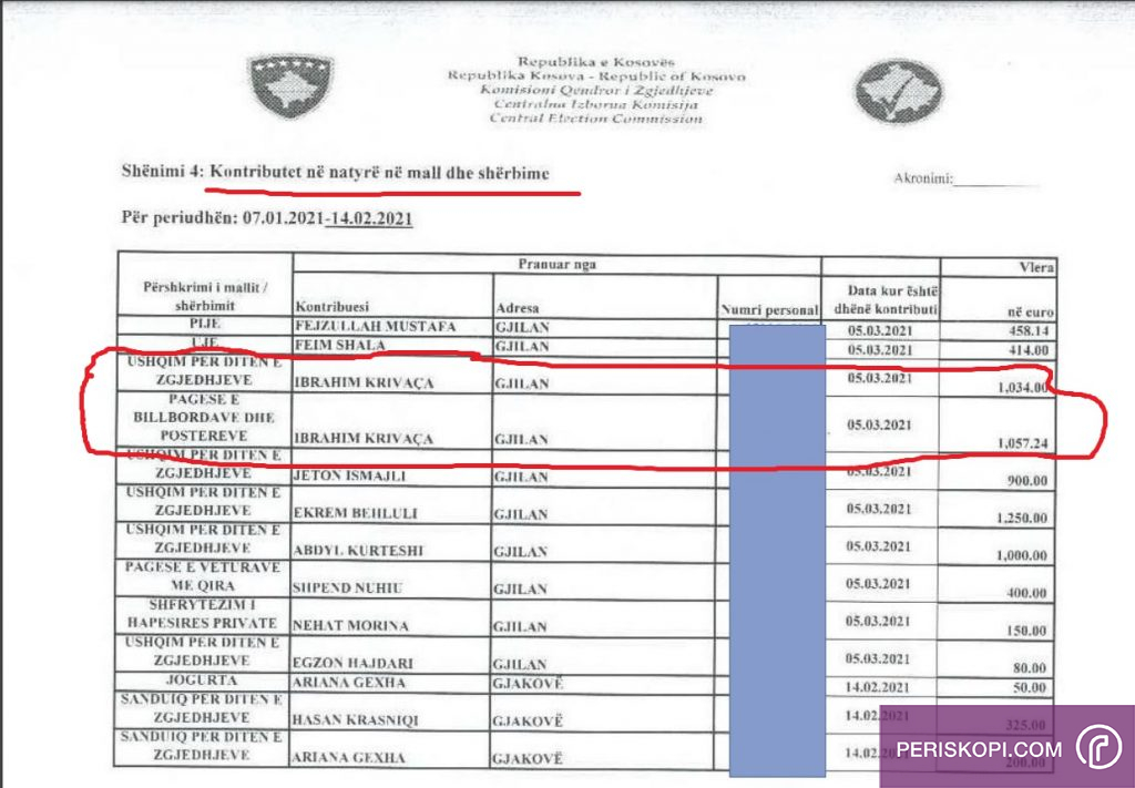 Bazuar në këtë raport që është i publikuar edhe në faqen e KQZ-së, Krivaqa ka paguar për LVV-në, ushqim për ditën e zgjedhjeve në një vlerë prej 1, 034.00 euro, dhe po ashtu, ka bërë një pagesë për billbord dhe poster të LVV-së në një vlerë prej 1, 057.24 euro.