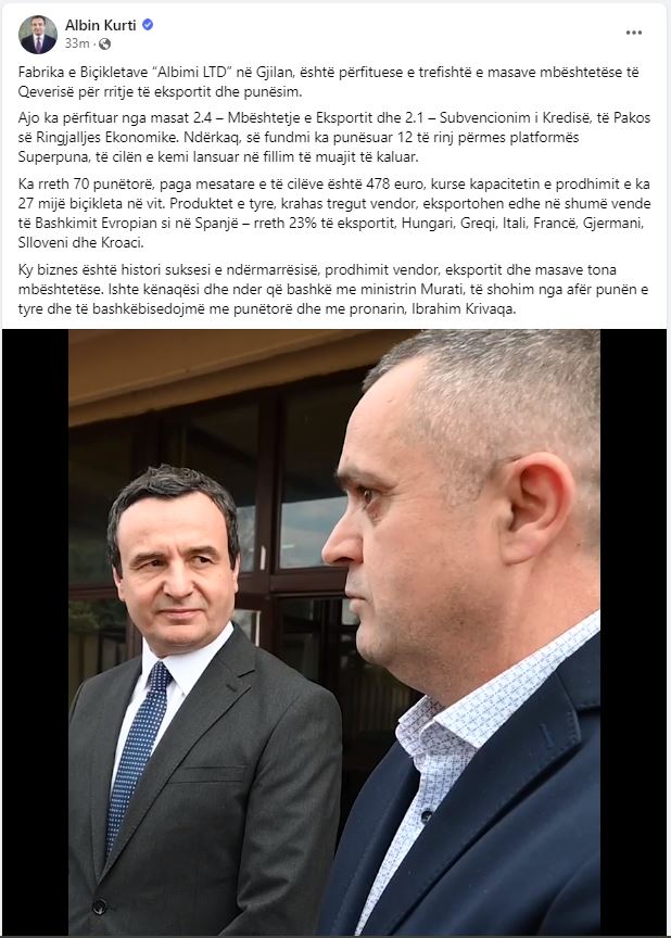 “Fabrika e Biçikletave “Albimi LTD” në Gjilan, është përfituese e trefishtë e masave mbështetëse të Qeverisë për rritje të eksportit dhe punësim. Ajo ka përfituar nga masat 2.4 – Mbështetje e Eksportit dhe 2.1 – Subvencionim i Kredisë, të Pakos së Ringjalljes Ekonomike. Ndërkaq, së fundmi ka punësuar 12 të rinjë përmes platformës Superpuna, të cilën e kemi lansuar në fillim të muajit të kaluar”, ka shkruar ndër tjera, mbi videon e publikuar Kurti.