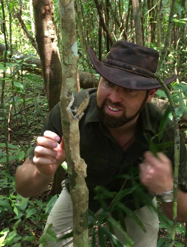 Biologu më pas hedh sytë nga hardhuca që qëndron e palëvizur me kokë poshtë në trungun e hollë, e cila ishte në dukje gjatë gjithë kohës. Eshte fjala per hardhucen bisht-gjethe, nje specie e kudondodhur ne Madagaskar.