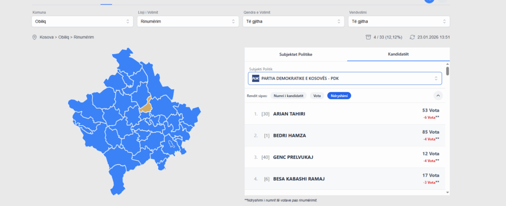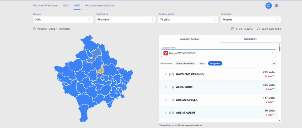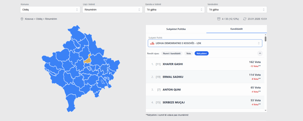 Në Komunën e Obiliqit do të rinumërohen 33 vendvotime, teksa deri më tani janë numëruar 4 prej tyre.
