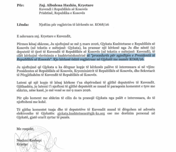 “Përmes kësaj shkrese, Ju njoftojmë se më 5 mars 2026, Gjykata Kushtetuese e Republikës së Kosovës (në tekstin e mëtejmë: Gjykata), ka pranuar një kërkesë nga Ju dhe nëntë (9) deputetë të tjerë të Kuvendit të Republikës së Kosovës (në tekstin e mëtejmë: Kuvendi), të cilët kërkojnë vlerësimin e kushtetutshmërisë së procedurës së zgjedhjes së presidentit”,