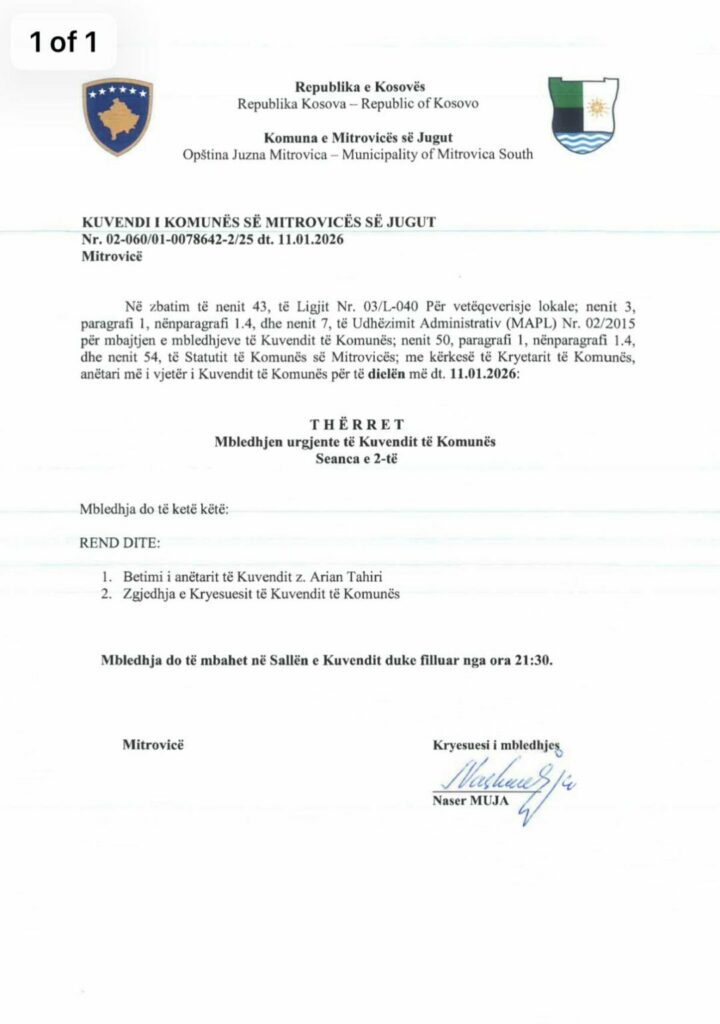 Arsyeja e ndryshimit të datës lidhet me zbatimin e nenit 43 të Ligjit nr. 03/L-040 për Vetëqeverisje Lokale; nenit 3, paragrafi 1, nënparagrafi 1.2, dhe nenit 5 të Udhëzimit Administrativ (MAPL) nr. 02/2015 për mbajtjen e mbledhjeve të Kuvendit të Komunës; nenit 50, paragrafi 1, nënparagrafi 1.2, dhe nenit 52, paragrafi 1, të Statutit të Komunës së Mitrovicës e cila parasheh mbajtjen e kësaj seance jo më larg se një muaj pas seancës konstituive e cila ishte mbajtur me 12 dhjetor 2025.