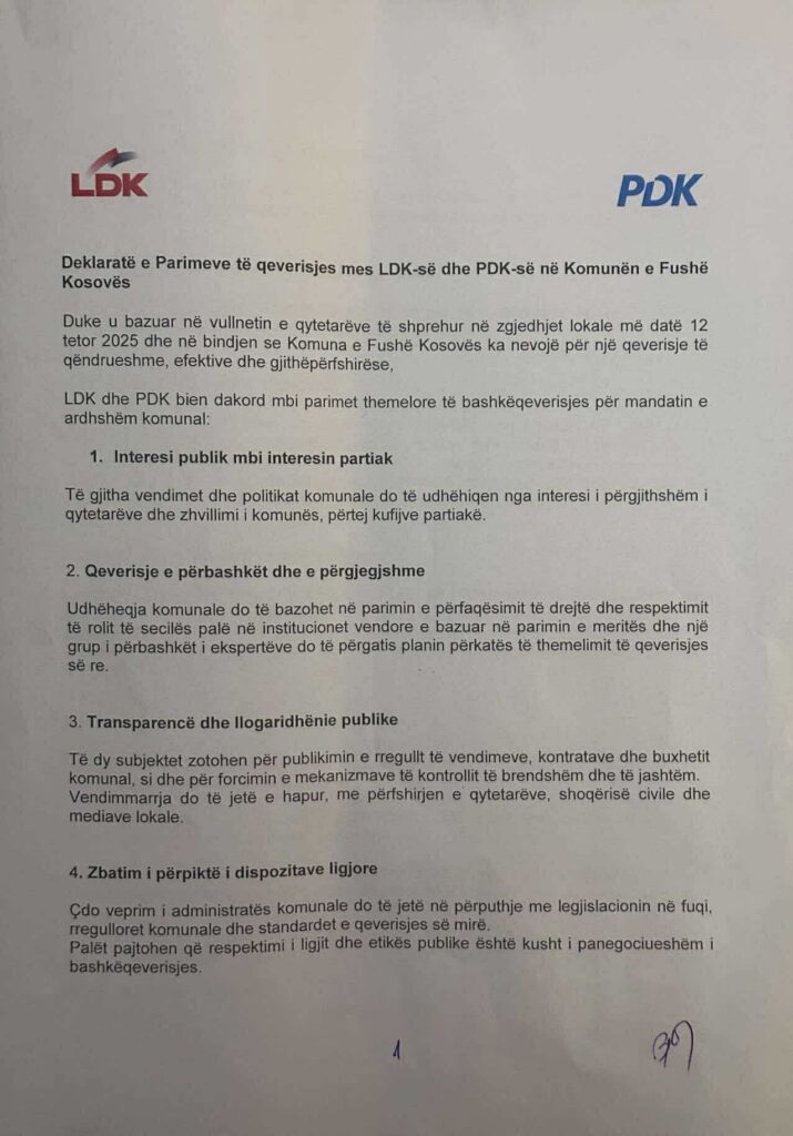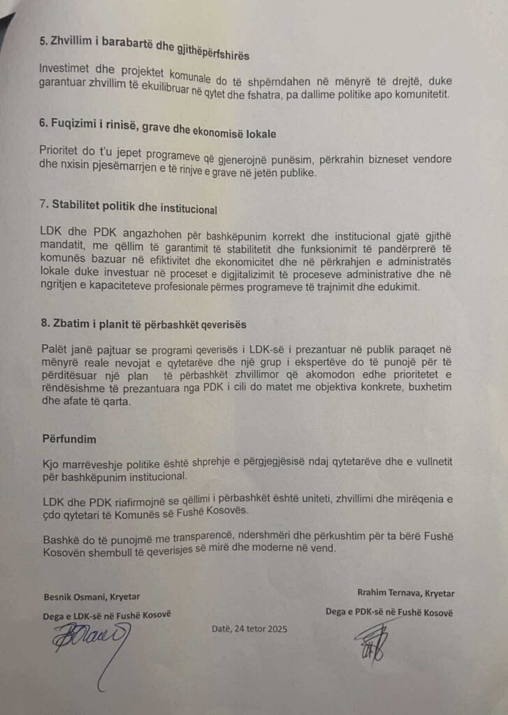 Kjo marrëveshje është shprehje e përgjegjësisë politike dhe e vullnetit të përbashkët për ta çuar Fushë Kosovën përpara, me një qeverisje moderne, transparente dhe në shërbim të qytetarëve.